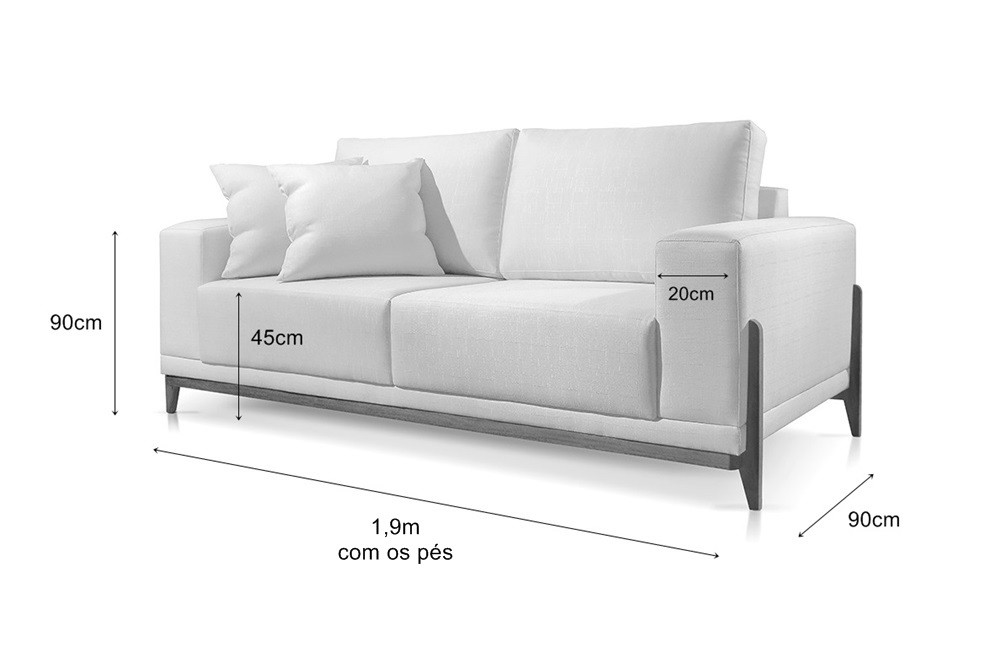 Para espaços maiores, pode-se combinar dois sofás de mesmo tamanho ou de tamanhos diferentes, como esse de 1,9m e outro de 2,1m, que também temos disponível.