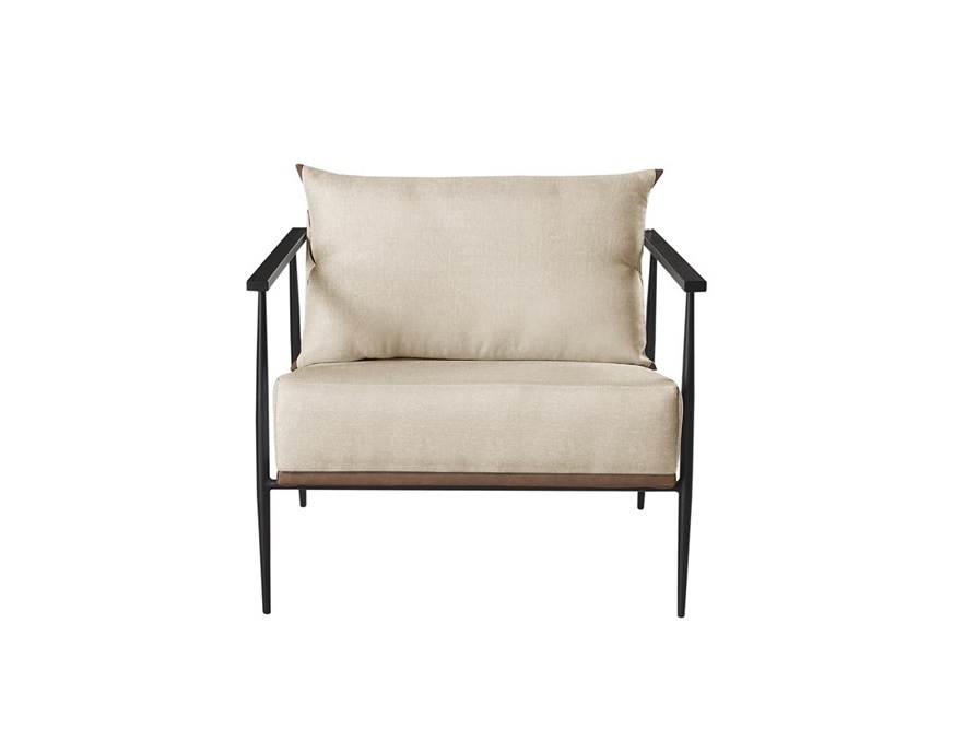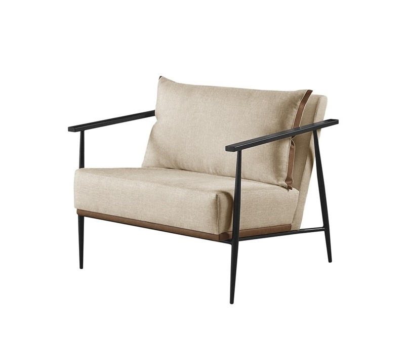 Encosto com almofada solta 100% fibra siliconada. Detalhe em material sintético na almofada e lateral do assento.