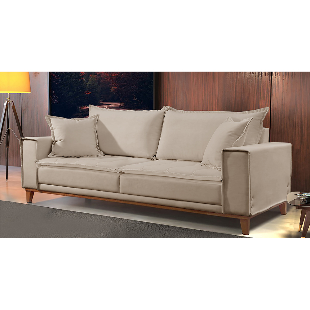 Sofá Margot com design elegante que combina a base de madeira, com o pillow top do assento, as almofadas de encosto, finalizando com o debrum no acabamento e o detalhe dos botões nas laterais. O resultado é uma peça linda que se adequa bem a diversos estilos e deixará seu ambiente moderno e confortável!