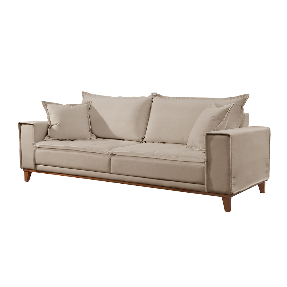 Sofá Margot com design elegante que combina a base de madeira, com o pillow top do assento, as almofadas de encosto, finalizando com o debrum no acabamento e o detalhe dos botões nas laterais. O resultado é uma peça linda que se adequa bem a diversos estilos e deixará seu ambiente moderno e confortável!