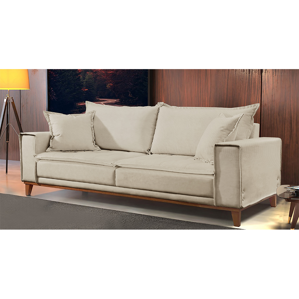 Sofá Margot com design elegante que combina a base de madeira, com o pillow top do assento, as almofadas de encosto, finalizando com o debrum no acabamento e o detalhe dos botões nas laterais. O resultado é uma peça linda que se adequa bem a diversos estilos e deixará seu ambiente moderno e confortável!
